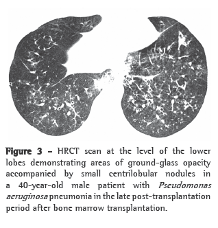 In our study sample, we observed that the most common HRCT findings in patients with post-BMT bacterial pneumonia were air-space consolidation, small centrilobular nodules and ground-glass opacities, typically distributed in the central and peripheral regions of the middle and lower lung zones. Further studies correlating such findings with clinical and laboratory data are needed in order to fully define the diagnosis of bacterial pneumonia after BMT, since the HRCT findings are similar to those seen in other infectious pulmonary complications following the procedure.