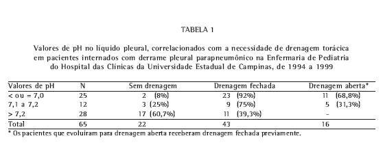 Em 65 prontuários havia os valores de pH pleural. Quanto menor o valor do pH, mais complicada foi a evolução e maior a necessidade de drenagem torácica, inclusive aberta, para resolução do quadro, principalmente quando abaixo de 7,2 (Tabela 1).