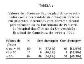 Em 177 prontuários havia os valores de glicose pleural. Quanto menor o valor da glicose, maior foi a necessidade de drenagem torácica, principalmente se abaixo de 50 mg/dl, mas as diferenças não foram tão significativas quanto ao observado com os valores de pH (Tabela 2).