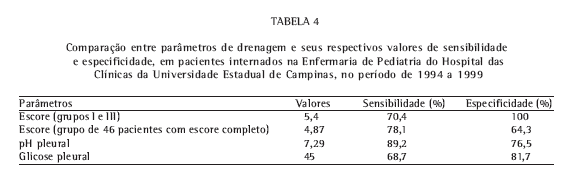 Comparando-se os valores bioquímicos isolados e os do escore, em termos de sensibilidade e especificidade, o presente estudo demonstra ser o pH o melhor parâmetro de drenagem, seguido pelo escore e glicose pleural (Tabela 4).