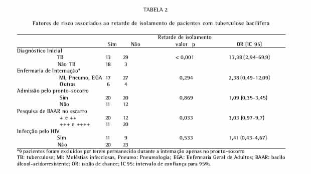 Retardo na instituição das precauções para aerossóis, avaliado pelo Intervalo 2, ocorreu em 31 casos (49,2%). Não houve diferença estatisticamente significativa na freqüência de retardo entre os diversos anos avaliados (p = 0,467). Treze pacientes não foram isolados em nenhum momento da internação (9 no pronto-socorro e 4 nas enfermarias); nestes casos, o conhecimento do resultado da pesquisa de BAAR ocorreu após a alta ou óbito do paciente. Ausência da suspeita clínica de TB no diagnóstico de admissão do paciente e baixa carga bacilar no escarro foram fatores associados ao retardo na instituição das precauções para aerossóis (Tabela 2).