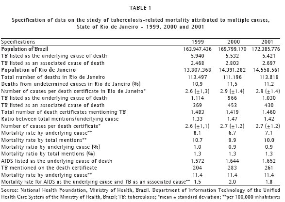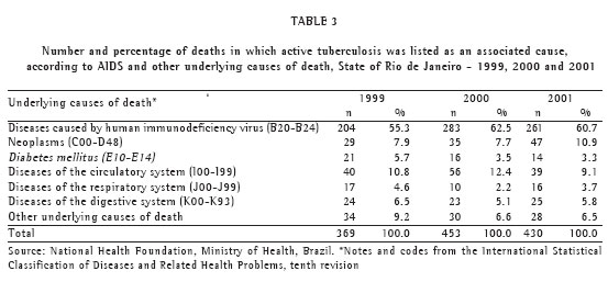 Objective: To evaluate deaths attributed to multiple causes in which tuberculosis was one of the causes listed. Methods: All deaths among residents of the state of Rio de Janeiro, Brazil, occurring between 1999 and 2001 and for which the death certificate mentioned tuberculosis, were investigated. The World Health Organization guidelines were used in characterizing the underlying and associated (non-underlying) causes of death. Results: In deaths from tuberculosis, conditions related to its natural history were the principal associated causes, together with alcoholism and diabetes. In approximately three-fifths of all deaths for which tuberculosis was listed as an associated cause, the underlying cause of death was acquired immunodeficiency syndrome. High proportion of ill-defined causes of death, low values found for the number of causes informed per death certificate and for TB as an associated cause point towards a certain degree of underestimation of the actual number of TB-related deaths in Rio de Janeiro State. Conclusion: The study shows that the rates of tuberculosis-related mortality in the state of Rio de Janeiro, calculated based on the number of times tuberculosis was listed as a cause of death (underlying or associated), are the highest in the country. Epidemiological studies of mortality are recommended as a means of guiding the activities of the tuberculosis control program.