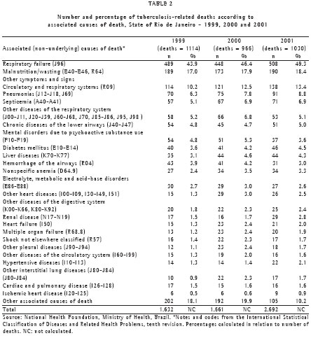 DISCUSSIONThe tuberculosis-related mortality rates observed in the state of Rio de Janeiro from 1999 to 2001 are the highest in the country. These mortality rates are more than twice as high as those found for Brazil as a whole, as well as being one and a half times higher than those seen in the state of São Paulo, for the same period.(19-20,25) The use of multiple causes of death was found to be a more comprehensive means of studying tuberculosis-related mortality. The recovery of the deaths in which tuberculosis was identified as an associated cause increased the value of the mortality rate by the total number of times it was mentioned, 33%, 47% and 42%, in relation to the classical rate, in the three years of the period.