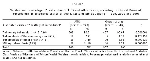 The mortality rates increased when the deaths in which tuberculosis occurred as an associated cause were taken into consideration, of which approximately three-fifths (around 60%) were due to AIDS. The low frequency of the test for human immunodeficiency virus leads to the hypothesis that the AIDS-related deaths have been underestimated.(15) A study in the five hospitals that concentrated the most tuberculosis-related deaths of residents in the state of Rio de Janeiro revealed that the test for the human immunodeficiency virus was carried out in only 25.8% of the deceased, and more commonly among the confirmed cases of tuberculosis.(13-14)