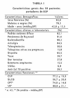 RESULTADOSForam avaliados inicialmente 63 indivíduos e 5 deles foram excluídos do estudo por apresentar ESP relacionada com exposição à sílica. Foram finalmente analisados os dados dos 58 pacientes restantes, cujas características gerais estão apresentadas na Tabela 1. A idade variou de 13 a 69 anos (média ± desvio-padrão: 42,8 ± 13,5 anos), o tempo de doença variou de 0,3 a 30 anos (mediana de 4 anos) e 63,8% possuíam doença cutânea difusa. A dispnéia foi o sintoma respiratório mais relatado (38 casos, 65,5%), seguida de tosse e dor torácica. Estertores crepitantes foram detectados em apenas 9 indivíduos (15,5%). O anti-Scl 70 foi detectado em apenas 17 pacientes (29,3%).