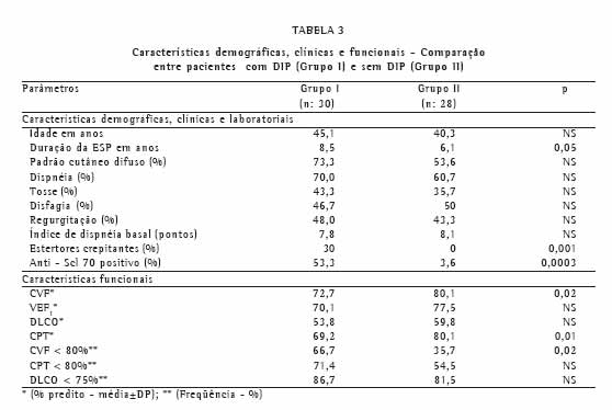Na Tabela 3 estão apresentados os resultados da comparação entre os pacientes com e sem DIP na TCAR. Os pacientes com DIP apresentaram maior duração da doença, maior freqüência de estertores crepitantes, menores valores de CVF e capacidade pulmonar total, e maior proporção de pacientes com redução da CVF (< 80% do predito). Não houve diferença entre os grupos quanto às outras variáveis, incluindo freqüência ou intensidade da dispnéia. Entre os pacientes com DIP, dispnéia não foi detectada em 9 casos (30%) e 6 deles eram assintomáticos respiratórios (20%). Estertores crepitantes foram detectados exclusivamente nos pacientes com DIP, porém em apenas 30% deste grupo. Houve associação positiva significativa entre DIP e positividade do anti-Scl 70.
