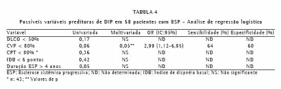 Na Tabela 4 estão descritos os resultados da análise multivariada. Das variáveis estudadas, somente a CVF menor que 80% do valor predito demonstrou tendência a ser preditora da presença de DIP no grupo avaliado (razão de chance = 2,99), com significância estatística limítrofe na análise multivariada. No entanto, essa variável apresentou baixa sensibilidade e especificidade para a identificação de DIP na ESP.