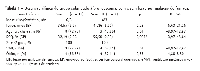 A Tabela 1 apresenta a descrição clínica do grupo de 18 vítimas de queimaduras faciais que foi submetido à broncoscopia com LBA, portadores ou não de LIF. Dos 18 pacientes com suspeita de LIF submetidos à broncoscopia, 7 (38,9%) tiveram o exame normal, e 11 (61,1%) tiveram o diagnóstico de LIF confirmado. A média de idade foi maior no grupo sem LIF (41,9 ± 6,9 anos) do que no grupo com LIF (34,6 ± 3,0 anos; p = 0,28). A maioria dos pacientes com LIF foi queimada com chama (72,7%). A SCQ foi significativamente maior nos pacientes com broncoscopia normal (p = 0,028). Do grupo de pacientes com LIF, 3 (27,3%) foram submetidos à ventilação mecânica invasiva, assim como 4 dos 7 pacientes sem LIF (57,1%). Tanto no grupo com LIF quanto no grupo sem LIF, 4 pacientes (36,4% e 57,1%, respectivamente) evoluíram para óbito.