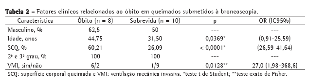 Os fatores relacionados ao óbito neste grupo de queimados submetidos à broncoscopia foram também analisados (Tabela 2). Dos 18 pacientes, 8 (44,4%) evoluíram para óbito, e 10 (55,6%) sobreviveram. A média de idade foi significativamente maior no grupo que evoluiu para óbito (44,8 vs. 31,5; p = 0,0369). A SCQ foi significativamente maior nos pacientes que evoluíram para óbito (60,2 vs. 26,09; p < 0,0001). Dos sobreviventes, apenas 1 paciente (14,3%) foi submetido à ventilação mecânica invasiva, enquanto 6 pacientes (85,7%) dos 8 que evoluíram para óbito foram submetidos ao mesmo tipo de intervenção (p = 0,0128).