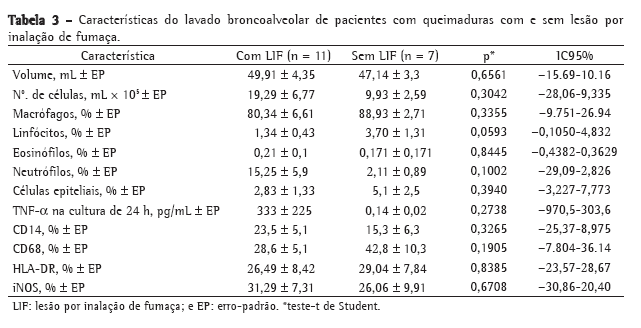 O conteúdo celular e proteico do LBA das vítimas de queimaduras com ou sem LIF foi analisado (Tabela 3). Não houve diferenças estatísticas entre os diversos parâmetros analisados no LBA dos pacientes com queimaduras faciais com ou sem LIF. O único parâmetro que se aproximou do nível de significância foi o percentual de linfócitos, que se mostrou diminuído nas vítimas de queimaduras faciais com LIF comprovada (p = 0,059).
