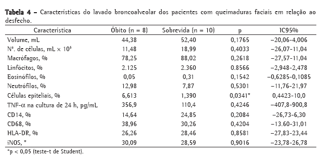 Objetivo: Analisar o lavado broncoalveolar (LBA) de vítimas de queimaduras que inalaram fumaça a fim de identificar alterações que possam estar associadas à morte ou à sobrevida. Métodos: Dezoito vítimas de queimaduras faciais foram submetidas a LBA até 24 h após o evento, sendo realizadas a análise do conteúdo celular e proteico, incluindo TNF-α, HLA-DR, CD14, CD68 e iNOS. Resultados: Dos 18 pacientes submetidos à broncoscopia, 8 (44,4%) morreram durante o seguimento. A média de idade dos pacientes que morreram foi significativamente maior (44,7 vs. 31,5 anos). A superfície corporal queimada foi em média de 60,1% nos pacientes que morreram e de 26,1% nos sobreviventes (p < 0,0001). Entre os 18 pacientes submetidos à broncoscopia, 11 (61,1%) apresentaram sinais endoscópicos de lesão por inalação de fumaça, e 4 (36,4%) destes faleceram. Dos 7 pacientes sem sinais de lesão por inalação de fumaça, 4 (57,1%) faleceram. A média do número de células epiteliais ciliadas no LBA dos pacientes que morreram foi significativamente maior daquela dos sobreviventes (6,6% vs. 1,4%; p = 0,03). Os demais parâmetros analisados não mostraram diferença entre os grupos. Conclusões: A superfície corporal queimada mostrou ser um fator preditivo de mortalidade. O aumento do número de células epiteliais ciliadas no LBA, denotando descamação epitelial brônquica, esteve associado à maior mortalidade de pacientes com queimaduras faciais.