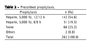The collection of data related to the selected patients and the evaluation of the use of prophylaxis were performed at a single time point by reviewing patient charts and prescription forms. We did not set a specific time point for data collection during the hospital stay. Data collection was performed by residents in internal medicine, who were previously trained in the appropriate techniques. In addition, the physicians responsible for prescribing to patients were not informed of the study. The main variables studied were age, gender, serum creatinine levels, risk factors for VTE, contraindications to the use of heparin, type of surgery, and type of anesthesia, as well as type of prophylaxis prescribed and dose prescribed.