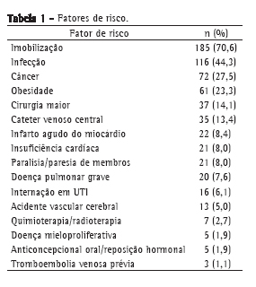 Na Tabela 1 são relacionados os fatores de risco para a TEV mais encontrados entre os pacientes internados no hospital, sendo os principais imobilização (em 70,6%), infecção (em 44,3%), câncer (em 27,5%), obesidade (em 23,3%) e cirurgia maior (em 14,1%).
