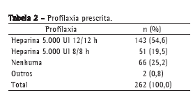 Na Tabela 2 estão relacionados os métodos utilizados para a profilaxia de TEV. Não foi encontrada nesta avaliação nenhuma prescrição de heparina de baixo peso molecular (HBPM) para a profilaxia de TEV.
