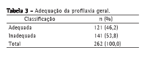 Quando analisamos a adequação da profilaxia em relação ao protocolo criado para o hospital, notamos que 141 pacientes (53,8%) tiveram prescrição inadequada e 121 pacientes (46,2%) tiveram prescrição adequada, considerando-se o nível de risco do paciente e a presença de contraindicações (Tabela 3).