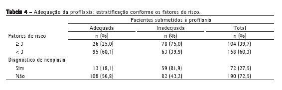 O perfil de gravidade dos pacientes foi avaliado pela análise do número de fatores de risco para a TEV. Apenas 4% não apresentavam nenhum fator de risco, e mais de 40% tinham três ou mais fatores de risco. No grupo com múltiplos fatores de risco, considerado de alto risco, 75,0% dos pacientes recebiam profilaxia para a TEV classificada como inadequada conforme o protocolo da instituição em comparação com 39,9% dos pacientes com menos de três fatores de risco (p < 0,001; Tabela 4). A proporção de pacientes com prescrição de profilaxia considerada inadequada entre os pacientes portadores de neoplasia foi maior. Embora também reconhecidos atualmente como pacientes de alto risco, somente 18% dos pacientes recebiam prescrição de heparina para a profilaxia para a TEV de forma adequada, diferença essa considerada estatisticamente significativa quando tais pacientes foram comparados ao grupo sem diagnóstico de neoplasia (p < 0,01; Tabela 4).