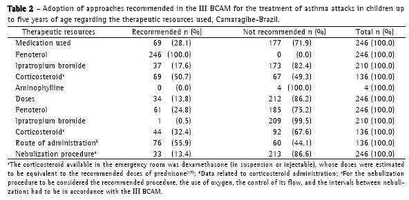 Although the three groups of drugs chosen for the treatments were in accordance with the Consensus guidelines,(1-4) the same did not occur with regard to their form of use, such as the use of anticholinergics for mild and moderate asthma attacks, corticosteroid use in the first hour in non-corticosteroid-dependent patients, and the use of aminophylline, which were responsible for 1 ( 1.9%) of the non-recommended procedures.(1-4) There was, however, no association with the length of time each child spent in the emergency room (Table 2).