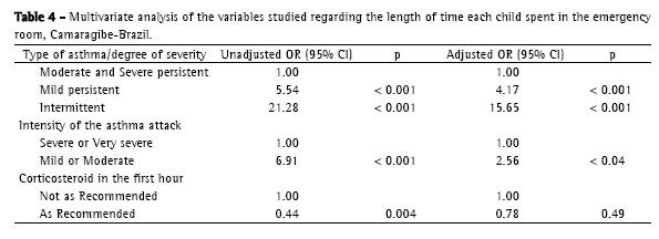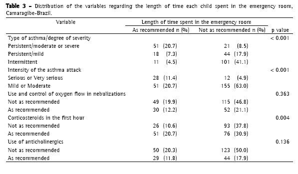 Table 3 shows that, in the less critical presentations in terms of the type of asthma and the intensity of the asthma attack, represented respectively by 101 cases of intermittent asthma (41.1%) and by 155 cases of mild or moderate asthma attacks (63%), in which the duration of the emergency room visit was not in accordance with the III BCAM, the result was essentially determined by the non-monitoring of the child for at least an hour after a good response to the treatment instituted. This "early" discharge from the emergency room may result in frequent subsequent emergency room visits or even in the "underestimation" of the child asthma attack on the part of the family, which makes it difficult to identify any signs of worsening at home.