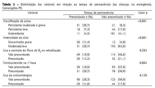 O uso de corticosteróide na primeira hora de atendimento mostrou uma associação com o tempo de permanência, pois o uso de corticosteróide na emergência possivelmente está relacionado a crises mais graves, em que os resultados com relação à observação das condutas propostas pelo consenso foram melhores (Tabela 3). Este resultado foi estatisticamente comprovado, com p = 0,004.