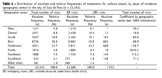 Therefore, we can attest to the importance of our results for the public health system, since, of the 25,243 patients diagnosed with asthma over the 12-month study period, 23,500 (93.1%) were treated in emergency rooms, and only 1743 (6.9%) were treated in the 24 UBSs. We observed that treatment for asthma attacks is regularly sought in emergency rooms, as reported in the cities of Pelotas (located in the state of Rio Grande do Sul) and Belo Horizonte (located in the state of Minas Gerais).(27,28) The present study was carried out in public institutions in the city of Juiz de Fora, and did not include any private institutions. Although treatment was available, since patients had access to emergency rooms and hospitals, the situation is less than ideal in the sense that those facilities should be responsible for curative treatment and not for preventive treatment.