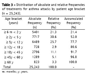 The ages of patients treated for asthma presented a non-normal distribution curve (median of 4 years), with 52% of patients being younger than 5 years of age and 77.7% being younger than 12 years of age - results that are in accordance with those of other studies that show greater vulnerability in the younger age brackets, which should be given priority in the development of prevention strategies.(10,26,29)