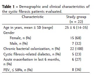 Of the 22 CF patients evaluated, 5 (22%) had CFRD. All 22 patients had chronic bacterial colonization, 6 (27%) had experienced one or more acute exacerbations requiring management with intravenous antibiotics in the last six months, and 8 (36%) had an FEV1 < 50%.