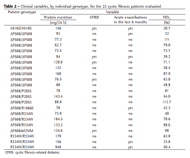 In the present study, the patients with the ΔF508 mutation presented lower protein excretion than did those with the R334W mutation (p < 0.05).