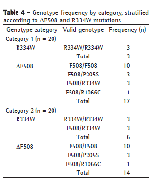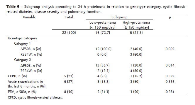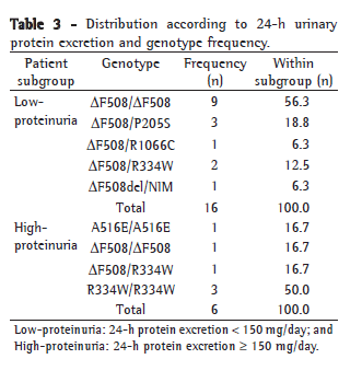 Protein excretion was normal in 90% of the patients who were homozygous for ΔF508 and in 100% of those with the ΔF508/P205S genotype. In the category 1 analysis, 66.7% of the patients with the ΔF508/R334W genotype also presented protein excretion < 150 mg/dL.