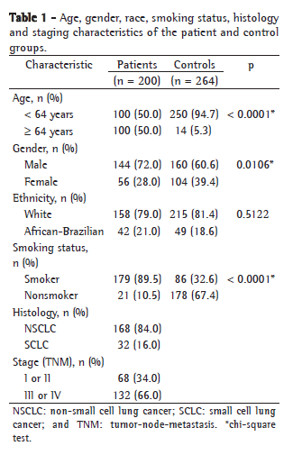 The study population included 200 patients with lung cancer (144 men and 56 women; mean age: 64.0 ± 9.7 years) evaluated in the Pulmonology Department of the State University at Campinas Hospital das Clínicas, located in Campinas, Brazil, between January of 2004 and December of 2006.