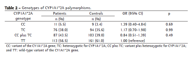 Patient and control samples were in Hardy-Weinberg equilibrium for CYP1A1*2A gene (c2 = 0.148; p = 0.76 and c2 = 1.12; p = 0.79, respectively).