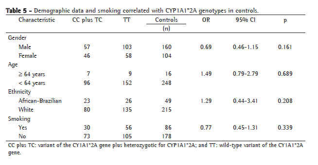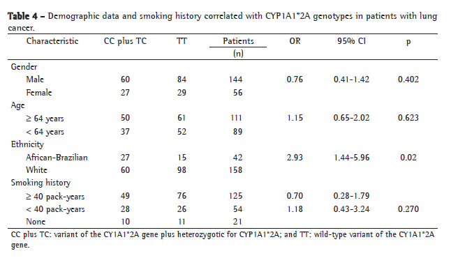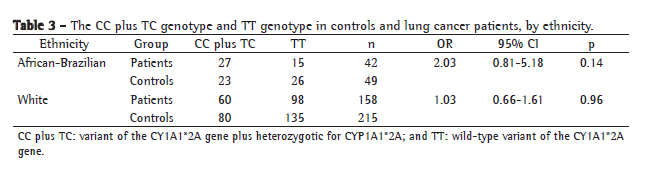 Table 4 shows the unadjusted odds ratios and 95% CIs for all of the studied variables, calculated using a logistic regression model for CYP1A1*2A in patients with lung cancer. When we focused specifically on ethnic groups, the CYP1A1*2A genotype CC plus TC was found to be more common among the African-Brazilian patients than among the White patients (OR = 2.93; p = 0.02).