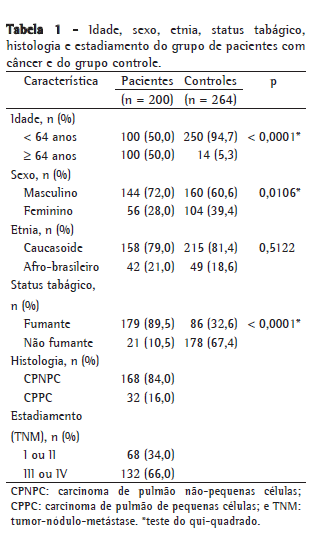 Como demonstrado na Tabela 1, os pacientes com câncer de pulmão eram mais velhos do que os controles (> 64 anos: 50,0% vs. 5,3%; p < 0,0001), e a proporção de homens e de fumantes foi maior no grupo de pacientes com câncer de pulmão do que no grupo controle (72,0% vs. 28,0%; p = 0,0106 e 89,5% vs. 32,6%; p < 0,0001, respectivamente).