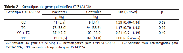 As amostras dos pacientes com câncer e as dos controles, avaliadas para o gene CYP1A1*2A, estavam em equilíbrio de Hardy-Weinberg (χ2 = 0,148; p = 0,76 e χ2 = 1,12; p = 0,79, respectivamente).