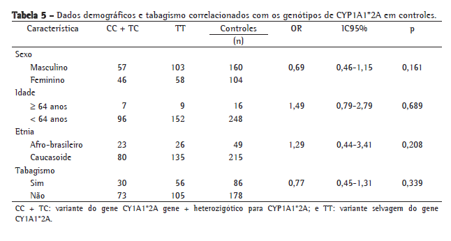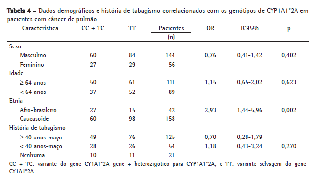 A Tabela 4 mostra as odds ratios não ajustadas e os IC95% para todas as variáveis estudadas, calculados utilizando-se um modelo de regressão logística para o CYP1A1*2A em pacientes com câncer de pulmão. Quando nos focamos especificamente nos grupos étnicos, observamos que o genótipo CC + TC do gene CYP1A1*2A foi mais prevalente em afro-brasileiros do que em pacientes caucasoides (OR = 2,93; p = 0,02).