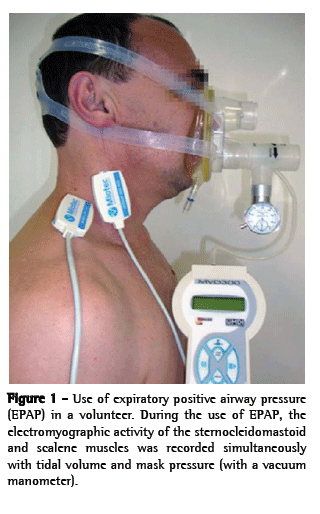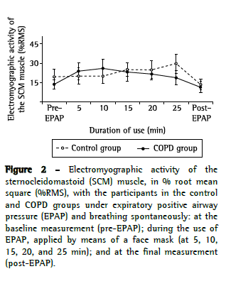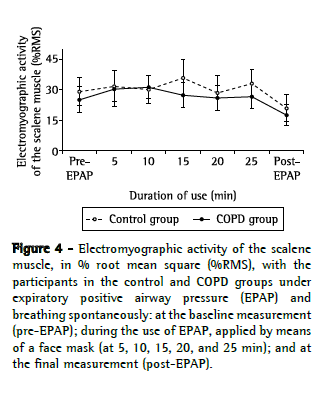 In conclusion, our study showed that the use of an EPAP of 15 cmH2O, applied with a face mask, promoted, after its withdrawal, a decrease in the electromyographic activity of the SCM muscle in healthy subjects and in patients with COPD. However, this did not occur regarding the electromyographic activity of the scalene muscle. This benefit should be considered when this pressure mode is recommended for patients with COPD, because there is usually an increase in the activity of the accessory inspiratory muscles in such patients.