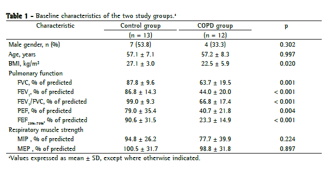 The sample comprised 25 participants, of whom 13 were healthy subjects (control group) and 12 were COPD patients (COPD group). There was a homogeneous distribution of participants in terms of gender, mean age, and respiratory muscle strength, represented by MIP and MEP. There were differences between the groups in terms of BMI (there were overweight subjects in the control group) and pulmonary function (all analyzed variables were reduced in the COPD group, which shows the losses caused by the disease; Table 1). Respiratory muscle strength was not significantly different between the groups, suggesting that COPD patients can maintain the pressures generated by the inspiratory and expiratory muscles. Despite the lack of statistical significance, which was probably due to the sample size, it is important to emphasize that there was a significant decrease in MIP in the COPD group (Table 1).