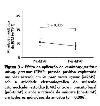 Ao contrário do que se esperava, a atividade eletromiográfica do escaleno não evidenciou alterações significativas com o uso da EPAP, apesar de ter apresentado um aparente aumento durante a sua aplicação e uma tendência a redução após sua retirada. Esse achado vai ao encontro do resultado de um estudo, no qual, objetivando avaliar o comportamento do músculo escaleno em indivíduos hígidos sob o uso da PEEP de 5-15 cmH2O, demonstrou-se que, durante a aplicação dos dois níveis pressóricos, houve um aumento da atividade fásica muscular respiratória e que, após a retirada do suporte pressórico, os níveis de atividade eletromiográfica retornaram à condição de antes da intervenção.(28) Os autores do estudo consideraram que o aumento do trabalho muscular inspiratório ocorreu devido à imposição de um gradiente de pressão na fase expiratória, o que demandou maior trabalho muscular inspiratório na tentativa de minimizar a diferença pressórica entre as fases inspiratória e expiratória.(28)
