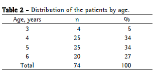 During the study period, 254 spirometry sessions were conducted, 74 of which included preschool children 6 years of age or younger. The population had a mean age of 4.80 ± 0.85 years and a median age of 5 years (range: 2.92-6.00 years; Table 1). Most children were 5 years of age or younger (Table 2). Male children predominated, at a ratio of 2:1, and there were no gender-related differences in test performance (p > 0.05).