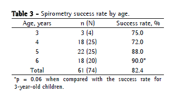 The limitations of the present study are those inherent to descriptive studies. The sample chosen consisted of children with respiratory diseases, preventing the extrapolation of our results to healthy children in the same age group. The fact that the tests were performed by an experienced professional who was interested in achieving maximum success might explain the high success rate found in our sample. In addition, only 4 children in our sample belonged to the age group at the highest risk for failure (≤ 3 years of age). However, this does not invalidate the results of the sample as a whole, a high spirometry success rate being found when the tests are performed by a trained and qualified professional.