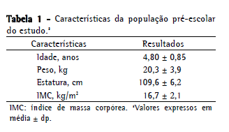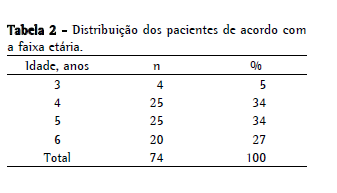 A população apresentava uma média de idade de 4,80 ± 0,85 anos e mediana de 5 anos (variação: 2,92-6,00 anos; Tabela 1). A maioria das crianças do estudo tinha idade inferior a 5 anos (Tabela 2). Houve predomínio de crianças do sexo masculino, na proporção de. 2:1, não havendo diferenças significativas no desempenho do teste de acordo com o sexo (p > 0,05).