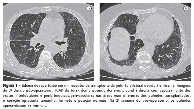 Apesar de a radiografia de tórax ser a forma mais comum de investigação radiológica, a TC pode fornecer informações adicionais valiosas (Figura 1). No pico de gravidade, o edema de reperfusão aparece nas zonas pulmonares superiores, médias e inferiores, como a doença intersticial reticular em 19%, 33% e 34% dos casos, respectivamente, ou como a doença dos espaços aéreos em 31%, 61% e 57% dos casos, respectivamente.(7) O edema de reperfusão é relatado como assimétrico em quase 20% dos pacientes submetidos ao transplante pulmonar bilateral.(7) As características na TC são inespecíficas e podem incluir opacidades alveolares peri-hilares, espessamento peribrônquico/perivascular, derrame pleural (Figura 1) e opacidades reticulares intersticiais/espaços aéreos localizados predominantemente no lobos médios e inferiores.(7)