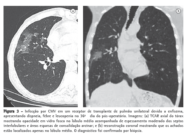 Em receptores de transplante pulmonar com infecção por CMV ativa, os achados da radiografia de tórax podem ser normais.(11) As TCs têm melhor captura das manifestações radiológicas da infecção, que afeta o órgão quase exclusivamente. As manifestações mais frequentes da TC são opacidades em vidro fosco, opacidades do tipo árvore em brotamento, consolidação dos espaços aéreos, nódulos, espessamento dos septos interlobulares, derrames pleurais, espessamento/aumento da pleura e bronquiectasias.(11-15) Outros patógenos pulmonares frequentes que afetam esta população incluem herpes vírus, adenovírus e vírus respiratório sincicial.(11)