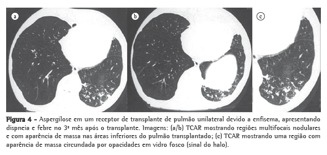 Nos receptores de transplante pulmonar, a pneumonia fúngica, que é tipicamente causada por Aspergillus spp. or Candida spp., é menos comum que a pneumonia por CMV; porém, está associada a maior mortalidade.(11,16,17) A pneumonia fúngica ocorre com mais frequência nos primeiros 2 meses após o transplante.(11) A infecção por Aspergillus spp. pode se apresentar como uma pneumonia indolente ou como uma infecção invasiva fulminante com disseminação sistêmica.(16,17) A infecção por Aspergillus pode também causar traqueobronquite ulcerativa, que frequentemente é oculta na radiografia, e que pode levar a deiscências anastomóticas.(11,17) Apesar de a Candida spp. frequentemente colonizar as vias aéreas, a infecção pulmonar invasiva é rara.(11) Apresenta-se a suspeita de infecção ou pneumonia fúngica anastomótica com base em esfregaços positivos/culturas de amostras de amostras de lavado broncoalveolar. Entretanto, uma vez que este organismos podem colonizar o pulmão transplantado, um diagnóstico definitivo de infecção invasiva fúngica exige uma biópsia transbrônquica.(11) Características típicas nas imagens da TCAR incluem: regiões de consolidação nodular focal e com aparência de massa; cavitação; nódulos (solitário ou múltiplos) com uma borda de opacidade em vidro fosco, conhecida por sinal do "halo" (Figura 4); e espessamento pleural.(16,17)