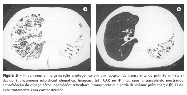 A prevalência de pneumonia em organização criptogênica entre os receptores de transplante de pulmão é 10-28%.(19) Esta síndrome clínico-patológica-caracterizada clinicamente por doença respiratória crônica ou subaguda e patologicamente por massas polipoides de tecido de granulação na luz de pequenas vias aéreas, dutos alveolares e alguns alvéolos-está associada a um grau variado de infiltração intersticial e do espaço aéreo por células mononucleares e macrófagos espumosos.(19) A TCAR frequentemente revela consolidação dos espaços aéreos, opacidades em vidro fosco e consolidação com aparência de massa e opacidades lineares ou reticulares (Figura 5). Achados adicionais incluem bronquiectasias, bronquiolectasias, fibrose, perda de volume pulmonar e aprisionamento aéreo.(19)