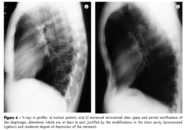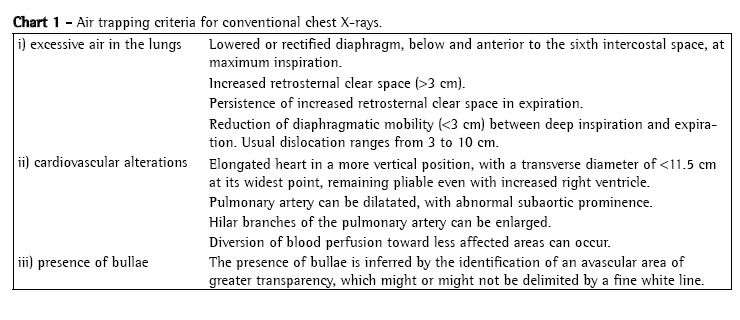 Some authors(15) reported that the length of the right lung and the height of the arch of the hemidiaphragm correlated well with FEV1 and FEV1/vital capacity ratio. In this study, a right lung length of 30 cm or more identified 70% of the patients with respiratory obstruction.(16) However, one author(17) reported that all of these studies presented errors, since they comprise excessive number of patients with chronic respiratory obstruction and, therefore, radiological characteristics of air obstruction receive "disproportionate value in the recognition of emphysema". It was also demonstrated that the sensitivity to chest X-ray is not good, ranging from 24%(18) to 80%.(19) In addition there is considerable intra- and inter-observer variation regarding classical radiological signs.(20) Radiological signs related to vascularization are subject to even greater intra- and inter-observer variation than are signs related to hyperinflation.(19)