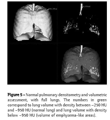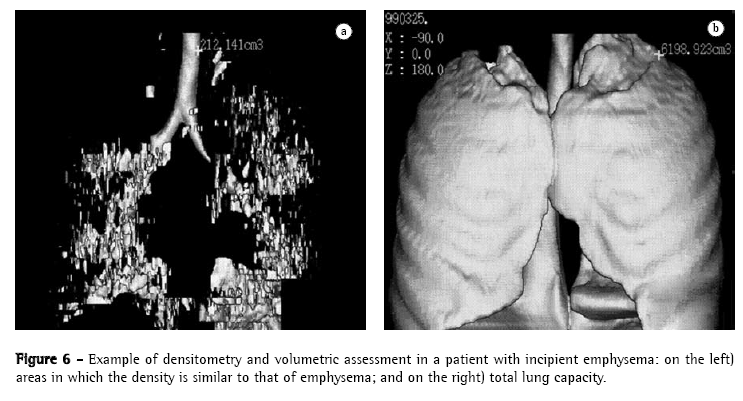 With the establishment of normality reference values,(55) it is already possible, as well, to use three-dimensional CT-guided densitometry and volumetric assessment in the early diagnosis and graduation of the severity of the disease, and this early detection and demonstration of three-dimensional imaging to the patient has been suggested as potentially useful in techniques of smoking cessation.(60) In addition, it also seems promising in the evaluation of patients whose occupational activities can induce the development of emphysema.