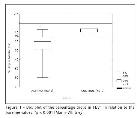 Of the 45 subjects with asthma, 36 presented positive BP with a mean 27.4% drop in FEV1 (range, 15-60%), mean variation, 4% (95% confidence interval) after HS inhalation. Of these 36 individuals with asthma, 26 (72%) still presented positive BP when a 20% drop in FEV1 was used as the cutoff value. Nine individuals presented negative BP, with 14% maximal drop in FEV1 (mean, 9%; range, 7-14%); mean variation, 1.7% (95% confidence interval), in the maximum cumulative inhalation period of 15.5 minutes. In the control group, maximal drop in FEV1 after HS inhalation in the maximum cumulative period of 15.5 minutes was 13% (mean, 8.5%; range, 3-13%), mean variation, 1% (95% confidence interval). The difference between the asthma group and the control group in terms of the response to BP with HS was statistically significant (p < 0.05; Figure 1). All the participants presented cough at the beginning of the inhalation and sialorrhea during the test. However, as the experiment progressed, the patients adapted and the symptoms disappeared.