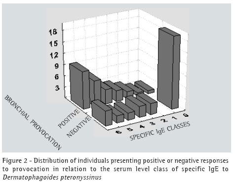 The family history of asthma and atopy, as well as the personal history of allergy, are risk factors for the development of BHR.(13) Regarding atopy, immunological changes include positive skin test response to allergens and high concentrations of circulating IgE.(25) The probability of developing clinical symptoms increases in parallel with the serum level of specific IgE antibodies, that could reach 100% when the levels are equal to or greater than 17.5 kU/L.(26) The sensitization to allergens varies depending on the region, although the most important antigens in positive skin tests or in the dosage of specific IgE in the solution are Dp and D. farinae,(27) the principal sensitizing agents for allergic airway disease of atopic subjects.(26) In this study, 93% of the patients with asthma were sensitized to Dp, which shows that testing for specific IgE antibodies to this allergen can be sufficient to identify most atopic individuals.(28-29)