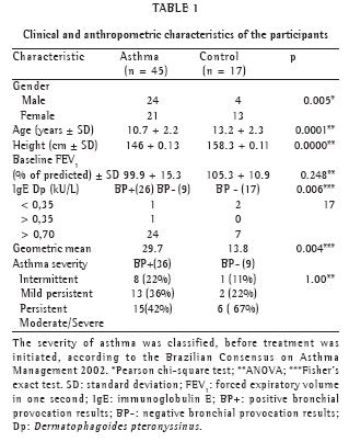 The control group comprised males and females, from 7 to 16 years of age, with no chronic or nocturnal cough, no wheezing, no atopic dermatitis, no signs of allergic rhinitis, no history of bronchodilator use and no family history of asthma. All presented serum levels of specific immunoglobulin E (IgE) to Dermatophagoides pteronyssinus (Dp) 0.35 kU/L. During the study, some individuals in the control group presented high levels of specific IgE antibodies to Dp and were therefore excluded.