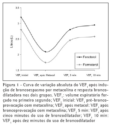 Os resultados obtidos neste estudo estão de acordo com as conclusões encontradas na literatura. Alguns autores,(7) em estudo randomizado com dezesseis pacientes asmáticos, compararam a velocidade e o grau de broncodilatação obtidos com o uso de 12 ug e 24 ug de formoterol liberado por inalador de pó seco com 400 ug de salbutamol liberado por nebulímetro pressurizado após broncoespasmo induzido por metacolina, e não encontraram diferença significativa entre os grupos. Outros(12) randomizaram dezessete pacientes asmáticos para receber, após indução de broncoconstrição por metacolina, formoterol a 12 ug, salmeterol a 50 ug ou salbutamol a 50 ug, todos liberados por inalador de pó seco. Não houve diferença estatística na rapidez de ação entre o salbutamol e o formoterol, porém ambos foram mais rápidos que o salmeterol. Resultados idênticos foram encontrados em outro estudo(5) que comparou o efeito broncodilatador do formoterol a 12 ug, salmeterol a 50 ug e salbutamol a 200 ug (liberados por nebulímetro pressurizado) em pacientes com asma moderada e grave.